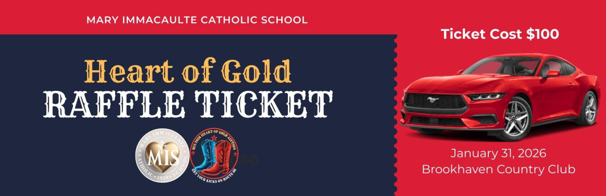 Experience the thrill of the open road with our grand raffle prize—a 2026 Ford Mustang. The winning ticket will be drawn on Saturday, January 31, 2026, during the Mary Immaculate Catholic School Heart of Gold Auction at Brookhaven Country Club.